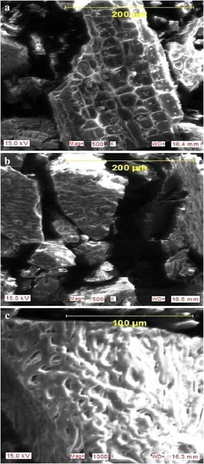 掃描電子顯微鏡通過用聚焦的電子束掃描來產(chǎn)生樣品的圖像。甲酸和乙酸吸附前后制備的活性炭的SEM圖如圖2所示 。 圖2a顯示吸附前活性炭的形態(tài)。碳表明活性炭的表面性質(zhì)是高度多孔的,并且會增強甲酸和乙酸的吸附。碳呈現(xiàn)不規(guī)則的網(wǎng)狀結構,這意味著由粗糙表面積組成的完整的三維多孔內(nèi)部結構的形成。熱解過程中焦炭的孔隙發(fā)育也很重要,因為這將通過促進活化劑(HNO 3)分子擴散到孔中從而增加活性炭的表面積和孔體積,從而增加HNO 3碳相互作用,在活性炭表面產(chǎn)生更多的孔。活性炭表面上這些孔的發(fā)育可能是導致水溶液中乙酸和加速那吸收量高的主要因素。很明顯在圖2 B,C的吸附前活性炭的表面上的大的孔碳的表面上吸附的吸附后均減少。這意味著甲酸和乙酸被吸附到制備的活性炭的表面上。