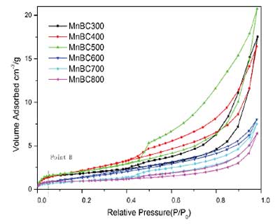 活性炭表面積和孔體積:活性炭的大部分孔徑分布在20和200之間,這表明碳主要是中孔(圖2)。表1顯示了碳化溫度和錳的顯著影響氯化物對孔隙發育和比表面積的影響。比表面積和孔體積隨著溫度從300℃升高到500℃而增加,在600℃時顯著下降,然后從600℃升高到800℃時再次增大。平均孔徑與表面積和孔體積呈相反的變化規律。出乎意料的是,高碳化溫度下的平均孔徑呈現出與以前研究不同的變化趨勢:孔徑不增加,反而下降。通常,活性炭的孔徑分布取決于活化溫度,原料和保留時間。在一定溫度范圍內增加碳化溫度增加了前體中揮發性物質的演變,使得孔隙發育的益處和創造新的孔隙。的熱解作用,當超出該范圍時,會造成微孔的崩潰和微孔的寬顯著量中孔,質量只是下降。高熱解溫度下的異常變化趨勢表明,活化劑必須在生物炭的孔結構和比表面積上有所不同。