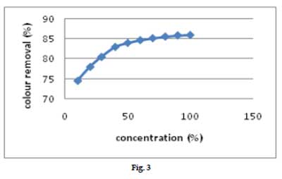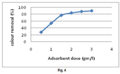 活性炭劑量對顏色去除的影響如圖4所示。觀察到每單位重量活性炭的顏色去除隨著活性炭負載的增加而降低。另一方面,隨著活性炭負載從0.5增加到2.0g / l,去除百分比從28%增加到97%。發現隨著活性炭的劑量增加至2g/l,顏色的降低增加,并隨著活性炭劑量的進一步增加保持幾乎恒定。