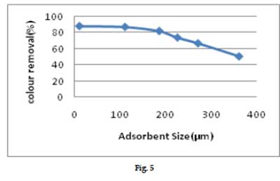 圖5顯示了活性炭顆粒尺寸對去除顏色的影響。從平臺上可以看出,對于固定的活性炭劑量,對于較小的吸附劑尺寸,顏色的去除率較高。此外,可以看出,隨著活性炭尺寸的幾何平均值的增加,去除百分比降低。這是因為,吸附是表面現象,較小的粒度提供相對較大的表面積,因此在平衡時發生較高的吸附。顆粒大小的影響為實現活性炭的最佳利用和填充床吸收器設計的穿透曲線的性質提供了重要的信息。