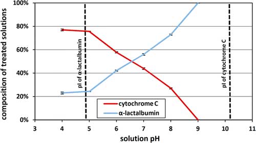 現(xiàn)用活性炭處理1:1溶液后剩余的細胞色素c和α-乳白蛋白的百分比隨溶液pH而變化很大。在pH4.0和5.0時,在等電點4.8附近除去最大量的α-乳白蛋白。(28)相比之下,最大量的細胞色素c在pH9.0被除去,最接近蛋白質的等電點10.5。(27)在6.0或7.0的中等pH下,活性炭除去了相似量的兩種蛋白質。