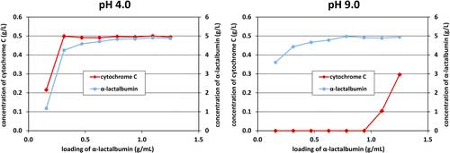 圖2. 在pH4.0或pH9.0的0.5mg / mL的細胞色素c和5.0mg / mL的α-乳清蛋白溶液通過色譜柱后,收集12.5mL級分中的細胞色素c和α-乳清蛋白的濃度活性炭。