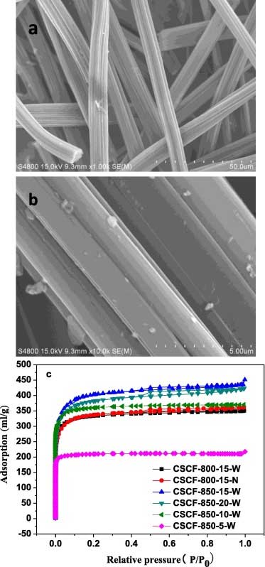SEM和氮吸附/脫附等溫線進行選擇活性炭來說明表面形態和孔結構。如圖所示圖一,棉桿制成的活性炭形態是光滑的,并且微晶是清楚的。在不同活化溫度制備四個選定的樣品的氮吸附等溫線和停留時間。它可以從中可以看出該四個選擇的樣本的所有的等溫線顯示了在低的相對壓力的急劇增加(P / P 0< 0.05),說明在碳骨架大量微孔的產生。活性炭的等溫線的下面部分幾乎是線性的,吸附和解吸的分支基本上是一致的。