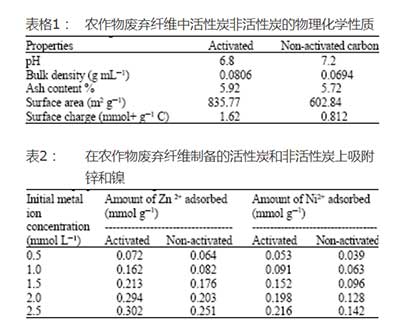 由農作物纖維制備的活性炭已經用于在初始金屬離子濃度范圍內吸附Ni2+和Zn2+。從結果中,發(fā)現金屬離子的吸附容量為:Zn2+>Ni2+。這一結果表明,這種纖維是一種無商業(yè)價值的農業(yè)副產品,可用于清除水性廢水中的金屬離子。因此,通過這一過程,用于常規(guī)污水處理的商業(yè)活性炭或其他化學品所花費的資金要少很多并且難呢過有效利用廢物。